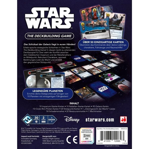 | Inhalt/Ausstattung | 10 Imperium-Starter-Karten, 10 Rebellen-Starter-Karten, 90 Galaxis-Karten, 10 Outer-Rim-Piloten-Karten, 20 Stützpunkt-Karten, 1 „Gleichgewicht der Macht“-Leiste, 50 Schadensmarker, 20 Ressourcenmarker, 1 Machtmarker | ||