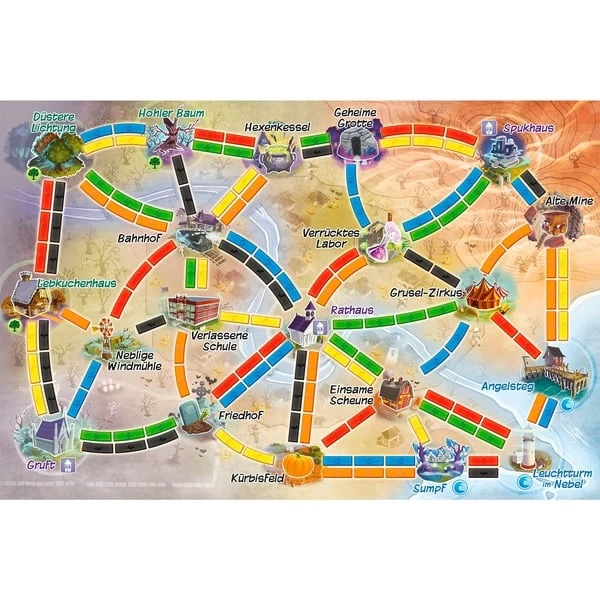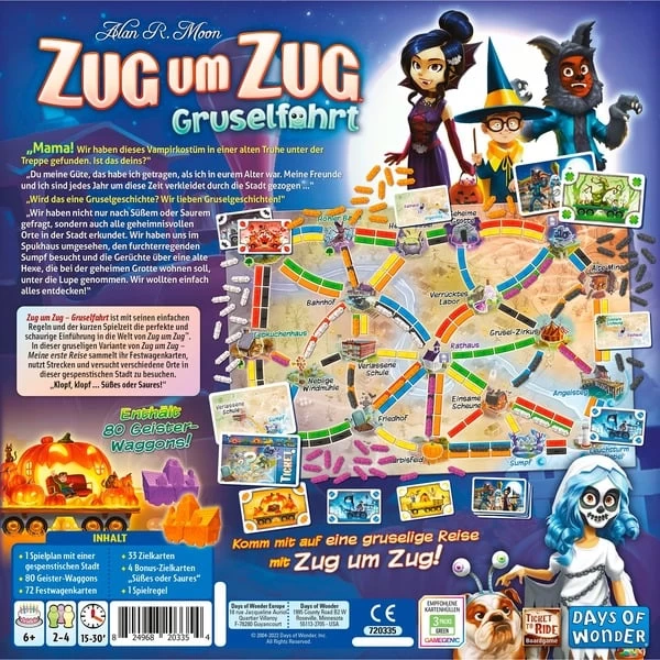 | Zubehör | vorhanden | 1 Spielplan, 80 Geister-Waggons, 72 Festwagenkarten, 33 Zielkarten, 4 Bonus-Zielkarten „Süßes oder Saures“ | |