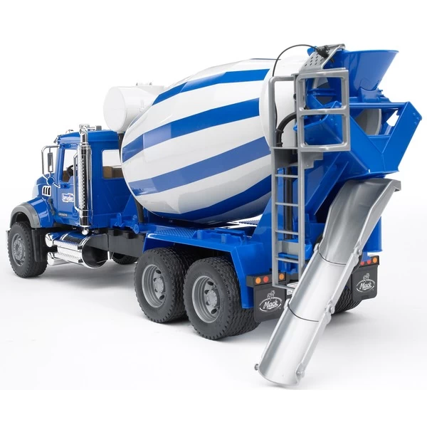 Der MACK Granite Betonmisch-LKW ist ein wahrer Hingucker nicht nur für Trucker-Fans. Die realistische Fahrerhauskabine hat Türen zum Öffnen, eine kippbare Motorhaube, die die Sicht auf den Motorblock ermöglicht, einklappbare Rückspiegel und vielen Anbauteilen mit Chromeffek. Die Trommel des Betonmischers kann durch eine im „Wassertank“ (Atrappe) versenkte und herausklappbare Handkurbel gedreht werden (Trommel mit Mischspirale). Je nach Drehrichtung wird Ladegut in die Trommel gefördert diese entleert. Die am Aufbau seitlich montierten Rutschen können zur Verlängerung an die heckseitige Betonrutsche angesteckt werden.Art.-Nr.: 1416854