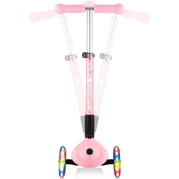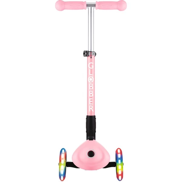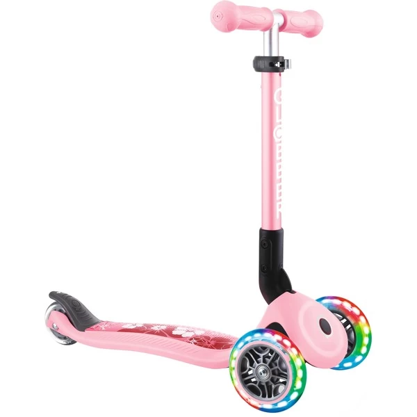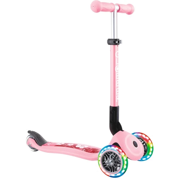 Mit dem Junior Foldabe Fantasy Lights von Globber kommen Kinder ab zwei Jahren auf Touren: Dieser Scooter steht auf drei Polyurethan-Rollen und hat ABEC 5-Kugellager. Die vorderen Rollen leuchten batteriefrei, der Lenker lässt sich in drei Höhen verstellen. Dabei kann über die Kippbewegung des Lenkers, der mit ergonomischen TPR-Griffen ausgestattet ist, gesteuert werden. Auf dem rutschfesten Deck finden auch kleine Füße sicheren Stand – die Reibungsbremse am Hinterrad verzögert zuverlässig. Zum einfachen Transport ist dieser Scooter faltbar oder kann im Trolley-Modus gezogen werden.Art.-Nr.: 1818461