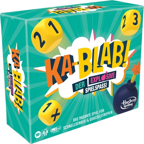 Mit Ka-Blab! erreicht das klassische Kategorienspiel ein neues Level und fordert Familien zu einem rasend-hitzigen Spielspaß heraus. Die Würfel entscheiden, wie viele Dinge in einer bestimmten Kategorie der Spieler ausplaudern muss – hier ist schnelles Denken angesagt, denn die Zeit läuft! Sobald der elektronische Timer in Form einer Bombe stoppt, verliert der Spieler, der gerade an der Reihe ist, eine Spielmarke. Wie viele Zeichentrickfiguren können Sie nennen? Welche Gründe für einen Hausarrest gibt es? Wer plaudert Sachen aus, die er am Telefon macht? Solche und weitere Dinge gilt es zu nennen, bis die Würfel endlich an den nächsten Spieler weitergegeben werden dürfen. Wer zum Schluss noch über Spielmarken verfügt, gewinnt! Das turbulente Spiel wartet mit 200 Kategoriekarten für jede Menge Überraschungen und Herausforderungen auf und sorgt für Spaß und Nervenkitzel beim nächsten Familien-Spieleabend. Für Spieler ab 10 Jahren geeignet. Art.-Nr.: 1771689