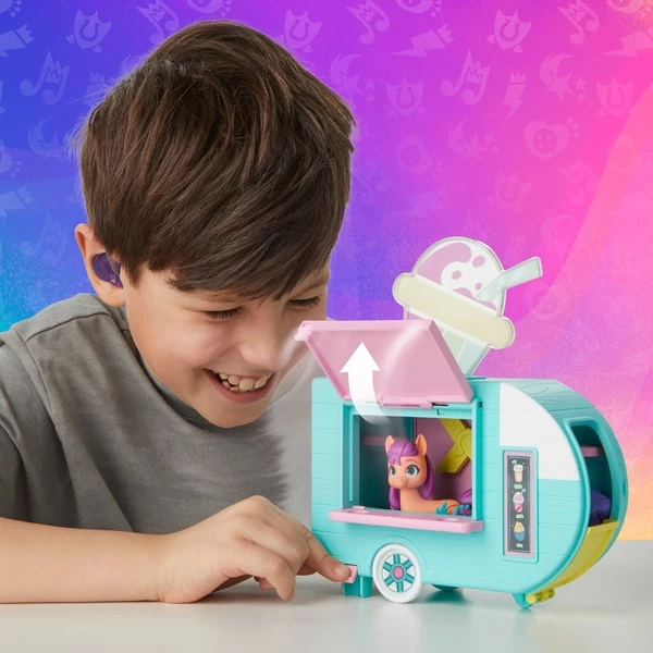 Mit dem Sunny Starscout Smoothie Truck können Fans von My Little Pony spielerisch magische Momente erleben. Sunny ist ein abenteuerlustiges Erdpony, das in ihrem mobilen Smoothiewagen mit Huf und Herz süße Leckereien herstellt. Dieses Spielset enthält eine 7,5 cm große bewegliche Ponyfigur, die in verschiedene Posen gebracht werden kann. Der Foodtruck lässt sich zu einer Spielküche öffnen, in der jede Menge Leckereien zu entdecken sind. Wird mit Sunnys Huf auf den Hebel des Trucks gedrückt, erstrahlt das Schild. Auch das Fenster des Trucks kann mit dem Huf geöffnet werden. Das Set enthält 15 Accessoires, von denen sich manche an Sunnys Huf befestigen lassen.Art.-Nr.: 1894048