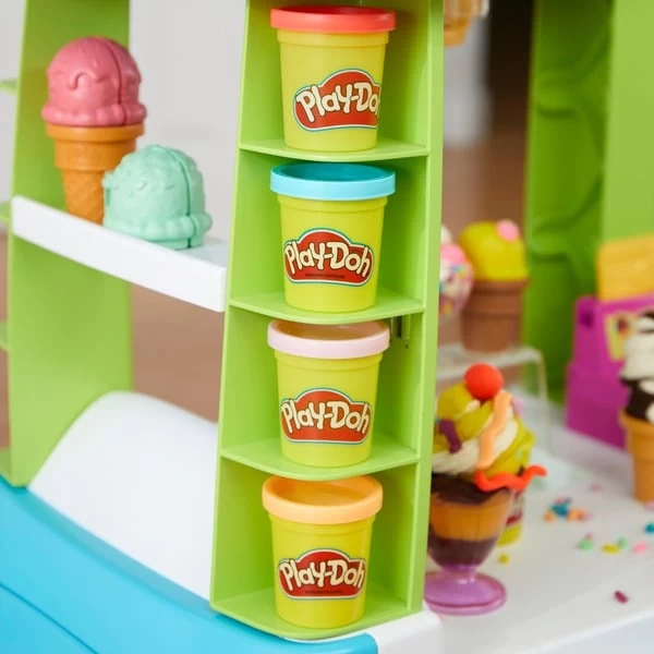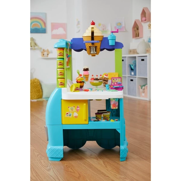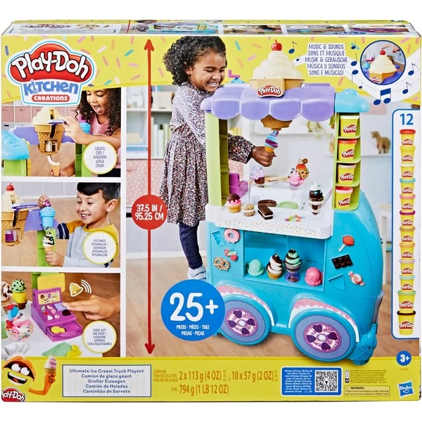 Mit dem großen Eiswagen von Play-Doh wird das Kinderzimmer zu einem ganz besonders coolen Ort, denn erbietet jede Mange Raum für fantasievolle Eiskreationen. Mit 27 Knetwerkzeugen und einer Softeisstation können kleine Eisliebhaber die herrlichsten Leckereien herstellen und dann mit Play-Doh-Streuseln und -Formen nach Lust und Laune dekorieren, bevor sie sie an der tollen Spielzeugkasse abkassieren. Lustige Musik und Kassengeräusche machen das Spielen im Eiswagen noch lebendiger und bei 12 Dosen Play-Doh stehen jede Menge Farben bereit. Art.-Nr.: 1852769