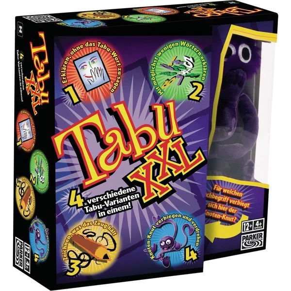 Tabu XXL – der GROSSE Partyspaß! Für Spielspaß und Abwechslung sorgen vier verschiedene Spielvarianten. Bei „Knoten-Knut“ müssen der Raterunde Begriffe „quasi pantomimisch“ anhand einer biegbaren Handpuppe erklärt werden, indem man „Knoten-Knut“ verbiegt und verdreht. Beim Zeichnen malt man, was das Zeug hält, denn die Sanduhr läuft gnadenlos weiter. Wer bis dato noch nicht punkten konnte, der darf sein Glück bei der „klassischen Tabu-Version“ versuchen. Wortwitz und Umschreibungsgabe ist gefragt, wenn man seinem Rateteam Begriffe erklären will, ohne das Tabu-Wort zu verwenden. Oder wie wäre es mit der Tabu-Variante für „Wortkarge“. Hier müssen mit 15 einzelnen Stichwörtern möglichst viele Begriffe erklärt werden. Dieses Spiel ist ein absolutes Muss für Partyspielfreunde und Tabu-Fans.Art.-Nr.: 1189542