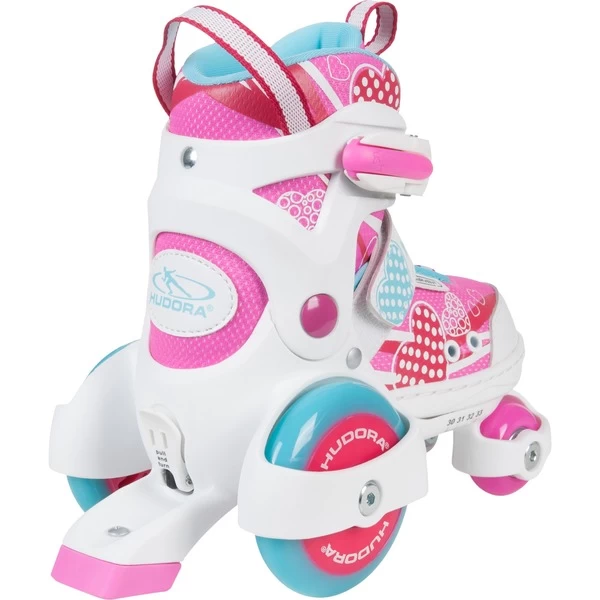 Die verstellbaren Kinderrollschuhe My First Quad machen erstes Rollschuhlaufen einfach und verhelfen schon den kleinsten Skatern zu schnellen Erfolgserlebnissen. Auf je vier leisen PU-Rollen und mit einem robusten PP-Chassis bietet der Rollschuh besonders viel Sicherheit und Stabilität beim Fahren. Die auf geschlossenen Kugellagern gleitenden High Rebound-Rollen sind mit einer Härte von 82A ideal für das Fahren auf dem Bürgersteig. Die Lenkung des My First Quad ist so eingestellt, dass die Spur ohne Probleme gehalten werden kann. Ein Gelenkschutz an Ferse und Knöchel gibt Halt, der integrierte Stopper an jedem Schuh macht Bremsen zum Kinderspiel. Die Stopper befinden sich am hinteren Ende des Schuhs, auch jüngere Einsteiger lernen hier also essentielle Bewegungsabläufe, die später beim Inlineskating wichtig werden. Mit zwei Push-Lock-Schnallen mit Ratschenband sind die Kinderrollschuhe schnell angezogen und optimal an den Fuß angepasst – das geht so einfach, dass Kinder die My First Quad einfach allein an- und ausziehen können. Luftlöcher in der Hülle und Aussparungen im Überschuh sorgen auch bei höchster Aktivität für eine optimale Belüftung. Der Innenschuh ist herausnehm- und abwaschbar. Das ungewöhnliche Design des My First Quad ist den besonderen Anforderungen von Fahranfängern angepasst. Die extra-großen Hinterrollen von 80 mal 20 Millimetern Durchmesser sorgen gemeinsam mit den kleineren Frontrollen (40 x 18 mm) für festen Stand – sind aber ebenso auffällig und fröhlich poppig gestaltet, wie das bunte Rollschuhdesign, das Kindern viel Freude bereitet. Lust auf Bewegung an der freien Luft ist vorprogrammiert. Der Kinderrollschuh My First Quad ist über einen Pull-and-Turn-Mechanismus sicher und stufenlos über einen Schlitten in acht Stufen größenverstellbar – dabei wächst er dank Kombigrößen (30-33) mit.Art.-Nr.: 1234870