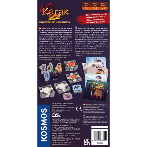 Der einstige Herrscher von Karak ist zurückgekehrt und fordert nun seinen Thron zurück. Um ihn stoppen müssen erneut Schätze gesammelt werden. Also, an die Würfel! In dieser Erweiterung sind neben dem Herrscher von Karak vier neue Helden, spannende Kampfarenen und neuartige Gegner enthalten. Der raffinierte Spielmodus lässt einen Mitspieler oder eine Mitspielerin zum mächtigen Herrscher aufsteigen. Die Erweiterung ist nur in Verbindung mit dem Grundspiel nutzbar.Art.-Nr.: 1877586