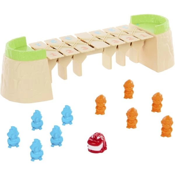 Verrückter Spielspaß mit Krokodilen: Zwei Spieler müssen ihre Spielfiguren über die Brücke auf die andere Seite bringen. Doch Vorsicht: Ein Alligator kann verhindern, dass sie ihr Ziel erreichen, indem er sie von der Brücke fallen lässt. Der Alligator wird unter die Brücke gerollt, um zu erfahren, wie viele Felder er vorrücken darf. Dabei können aber die Spielfiguren des Gegenspielers (oder sogar die eigenen) von der Brücke stürzen. Der erste Spieler, der drei seiner Spielfiguren auf die andere Seite bringt, gewinnt das Spiel. Art.-Nr.: 1919809