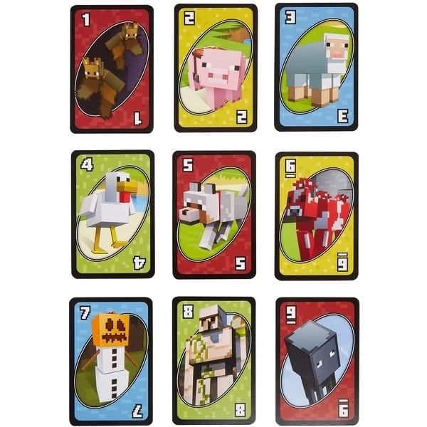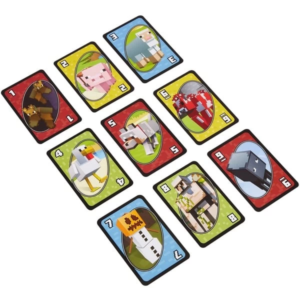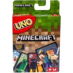 Wie beim klassischen UNO-Spiel geht es auch bei UNO Minecraft darum, als erster Spieler alle Karten abzulegen. Doch bei dieser Version sind auf den Karten Charaktere und Bilder aus Minecraft und es gibt eine besondere Regel: Wenn die letzte Karte auf der Hand eines Spielers zur gerade auf dem Ablegestapel oben liegenden Karte passt, sammelt der Spieler Punkte für Karten, die seine Gegner noch auf der Hand halten. Außerdem gibt es eine neue Aktionskarte: Wenn der Spieler die Creeper-Karte zieht, zeigt er sie den anderen Spielern, die dann drei weitere Karten ziehen müssen. Gewonnen hat der Spieler, der als Erster 500 Punkte hat. Art.-Nr.: 1888500