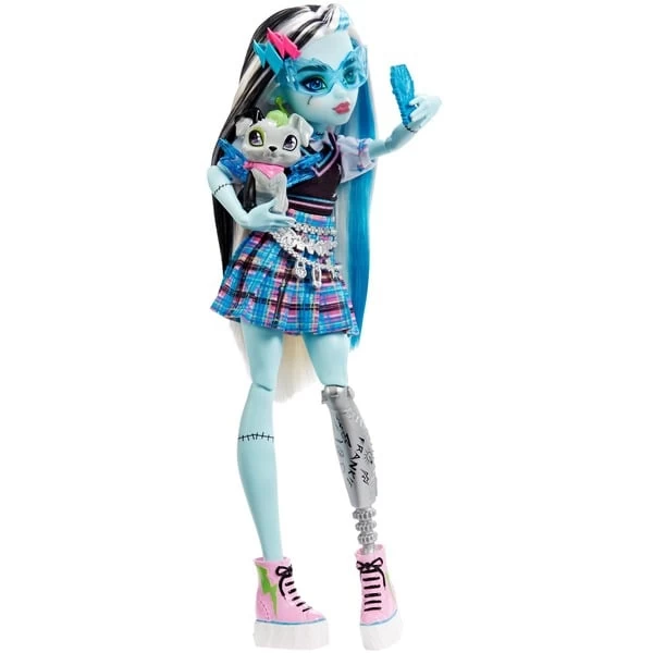 Die Schule hat wieder begonnen und die Ghule der Monster High tauchen in ihrem kreischtastischen Stil auf! Die Frankie Stein Puppe stolziert in elektrisierender Mode mit einem karierten Rock, einer Bluse mit Blitzdruck und einer Weste mit Stichdetails durch die Flure der Monster High. Ihr fabelhaft freakiger Look wird durch klobige Plateau-Sneakers, gruseliges Zubehör und eine Beinprothese sowie Stichdetails komplettiert, die ihren einzigartigen Stil zelebrieren. Der Frankie Stein Puppen-Look erreicht neue Horizonte mit einer Voltageous College-Jacke und elektrisierendem Zubehör. Und ihr gruselig-süßer Haustierhund, Watzie, inspiriert zu gespenstischem Geschichtenerzählen!Art.-Nr.: 1918890