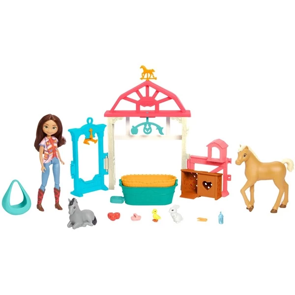 Mit DreamWorks Spirit & Friends Freundschaft, Mut und Abenteuer erleben! Hier verbringt Lucky den Tag mit Gesundheits-Checks für kleine Fohlen und Häschen und wiegt sie dann mit einem Schlaflied in den Traum. Luckys Fohlen-Pflegestation-Spielset bietet alles, was sie benötigt, um gerettete Fohlen und kleine Tierfreunde zu versorgen und zu füttern. Das Set enthält eine Lucky-Puppe (ca. 18 cm) und ist mit einem aufklappbaren Tierpflegebereich ausgestattet. Mit dabei sind auch zwei gerettete Fohlen, ein Häschen, ein Entenküken, eine Schmutzbürste, Äpfel und Karotten als Leckereien für die Tiere und eine Wasserflasche. Zu den verschiedenen Spielbereichen zählen eine Waage zum Wiegen der Babys (die Waage bewegt sich wirklich), eine Wiege, die sich durch Hufe aktivieren lässt, sodass Lucky und ihr Fohlenfreund Tiere in den Schlaf wiegen können (mit einem Mobile darüber, das sich dreht), eine Häschenkiste und ein Vogelhaus. Mit diesem farbenfrohen Set können Kinder fröhliche Situationen aus der Welt der Tierpflege nachspielen. Die Puppe kann nicht von allein stehen. Tolles Geschenk für Kinder ab 3 Jahren.Art.-Nr.: 1807754