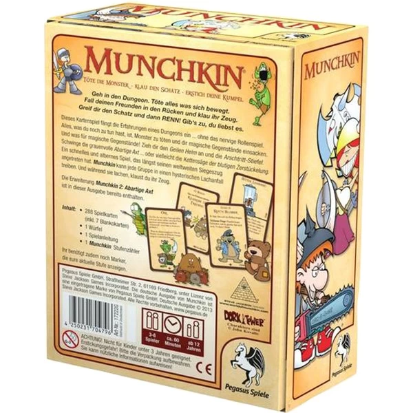 Ein schnelles und albernes Spiel, das längst seinen weltweiten Siegeszug angetreten hat. Munchkin kann jede Gruppe in einen hysterischen Lachanfall treiben. Und während sie lachen, klaust du ihr Zeug. Das Kultspiel liegt in der beliebten Doppelschachtel vor und enthält zudem die erste Erweiterung Munchkin 2: Abartige Axt. Um was es geht? Hieran hat sich nichts geändert: Geh in den Dungeon. Töte alles was sich bewegt. Fall deinen Freunden in den Rücken und klau ihr Zeug. Greif dir den Schatz und dann RENN! Gib’s zu, du liebst es. Dieses Kartenspiel fängt die Erfahrungen eines Dungeons ein … ohne das nervige Rollenspiel. Alles, was du noch zu tun hast, ist, Monster zu töten und dir magische Gegenstände einsacken… und steige Stufen auf!Art.-Nr.: 1194658