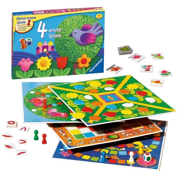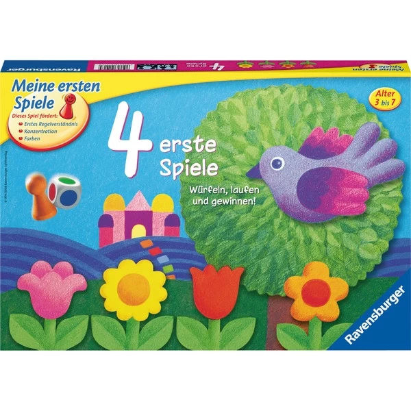 Würfeln, laufen und gewinnen! 4 erste Spiele ist eine Spielsammlung für Kinder ab 3 Jahren. Vier Farbwürfelspiele sorgen mit ihren einfachen Regeln und der kurzen Spieldauer für Abwechslung und Vergnügen. Dieses Spiel fördert: Erstes Regelverständnis, Konzentration, FarbenArt.-Nr.: 1187088