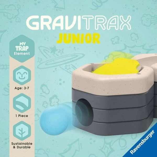 GraviTrax Junior bietet schon Kindern ab 3 Jahren einen leichten Einstieg in die Kugelbahn-Welten von GraviTrax. GraviTrax Junior ist ein interaktives Kugelbahnsystem. Jungs und Mädchen erschaffen damit ihre eigenen Kugelbahnwelten, die flexibel dekoriert werden können, wodurch ganz individuelle Themenwelten entstehen. Bau- und Spielspaß gehen dabei Hand in Hand. GraviTrax Junior kann durch Erweiterungen mit Bauteilen oder besonderen Elementen beliebig erweitert werden. Das GraviTrax Junior Element Trap verschluckt eine Kugel und lässt sie auf einer anderen Ebene wieder frei – ein toller Effekt. Art.-Nr.: 1913214
