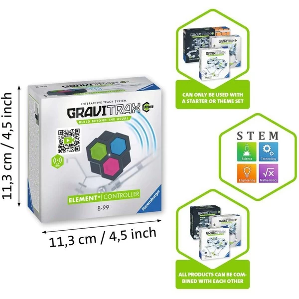 GraviTrax – das innovative Baukastensystem für anspruchsvolle Kugelbahnen. Aus einer Vielzahl an verschiedenen Bausteinen und Schienen lassen sich bei geschickter Nutzung der physikalischen Gesetze aktionsreiche Streckenverläufe planen, ausprobieren und realisieren. Mit den zahlreichen Erweiterungs-Sets wird das freie Bauen und Konstruieren des innovativen Bausystems GraviTrax jedes Mal aufs Neue noch interessanter und spannender! Mehr Möglichkeiten – mehr Spaß! Mit dem POWER Element Controller können auf Knopfdruck die Power-Elemente Weiche, Starter oder Lever (jeweils separat erhältlich) aktiviert werden. Damit kann der Lauf der Kugel aktiv beeinflusst werden. Art.-Nr.: 1894522