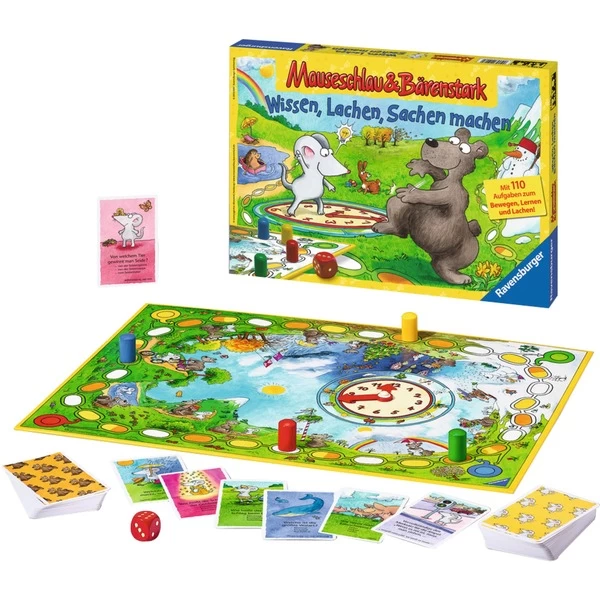 „Mauseschlau und Bärenstark stehen um sieben Uhr auf. Stelle die Uhr.“ So lautet eine Aufgabe der vielen mauseschlauen Wissenskarten. Dabei lernen die Kinder spielerisch die Uhr kennen. Andere Fragen helfen dabei, die Jahreszeiten zu verstehen oder mehr über bestimmte Tiere zu erfahren. Die bärenstarken Aktionskarten fordern die Spieler zu Aktionen wie dieser auf: „Flattere und gackere wie ein aufgescheuchtes Huhn.“ Wenn die Spieler die Fragen richtig beantworten und die Aktionen gut ausführen, gewinnen sie die entsprechenden Karten. Bei Mauseschlau & Bärenstark „Wissen, Lachen, Sachen machen“ ziehen die Spieler mit ihrer Spielfigur eine Runde um den Spielplan und entdecken dabei die unterschiedlichen Jahreszeiten. Sobald ein Spieler nach einer Runde sein Startfeld erreicht, endet die Spielrunde. Wer nun die meisten Wissens- und Aktionskarten sammeln konnte, gewinnt. Die Kombination aus Würfellaufspiel und Quizspiel sorgt für Abwechslung und durch die Aktionskarten kommt zusätzlich Bewegung und jede Menge Spaß ins Spiel.Art.-Nr.: 1329622
