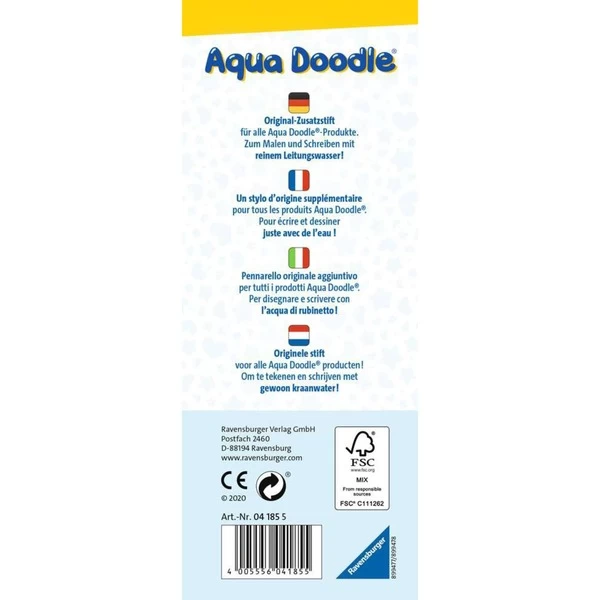 Der Aqua Doodle Zusatzstift ist ein Originalzubehör für das innovative Malsystem von Ravensburger: Einfach mit Wasser füllen und schon kann auf einer speziellen Matte blau gemalt werden. Dieser Stift sieht zwar aus wie ein Filzstift, arbeitet aber nur mit Wasser, hinterlässt keine Flecken und ist unbegrenzt nachfüllbar.Art.-Nr.: 1628686