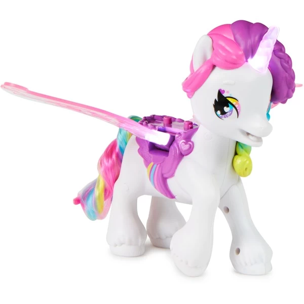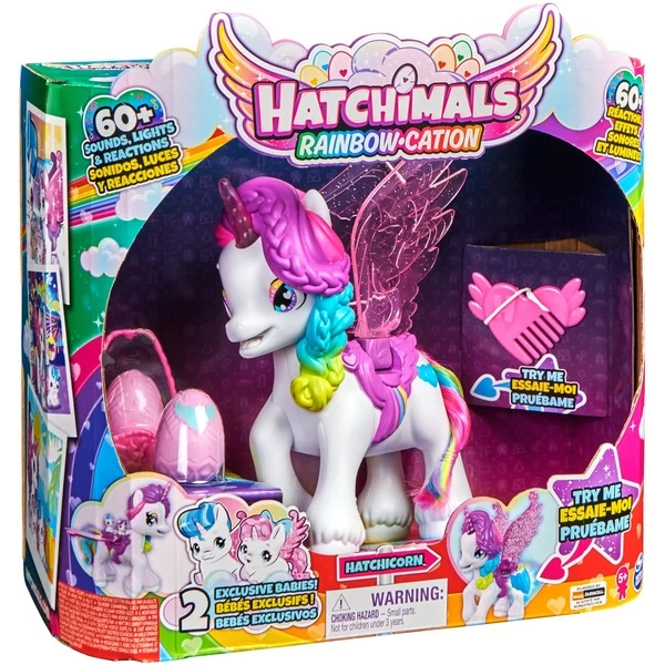 Dieses interaktive Hatchimals Einhorn – Hatchicorn – verfügt über 60 Geräusche, Lichter und Reaktionen und hat glitzernde Flügel, die leuchten und flattern! Es wird mit zwei exklusiven Zwillingsbabies, einem Korb und einem Kamm zum Bürsten seines weichen Regenbogenschwanzes geliefert. Die Baby-Einhörner verbergen sich zuerst in Ei, das geschlüpft werden muss. Setzt man dann auf den Sattel von des Hatchicorn, kann man sehen, wie es reagiert – es reagiert auf jedes Baby anders! Wenn man das Hatchicorn hochhebt, fängt es an, mit den Flügeln zu schlagen und Geräusche zu machen, während das Horn und die Flügel die Farbe wechseln! Es gibt verschiedene Flugmuster: Neige es nach oben, um seine Flügel schnell flattern zu lassen, oder neige es nach unten für einen langsamen Gleitflug! Während es fliegt, ändern sein Horn und seine Flügel weiterhin ihre Farbe. Wenn man die Babies in den Korb legt und den Griff in den Mund des Hatchicorns steckt, während es fliegt oder auf einer festen Oberfläche steht, hörst du fröhliche Geräusche, wenn sein Horn und seine Flügel wieder aufleuchten!Art.-Nr.: 1849594